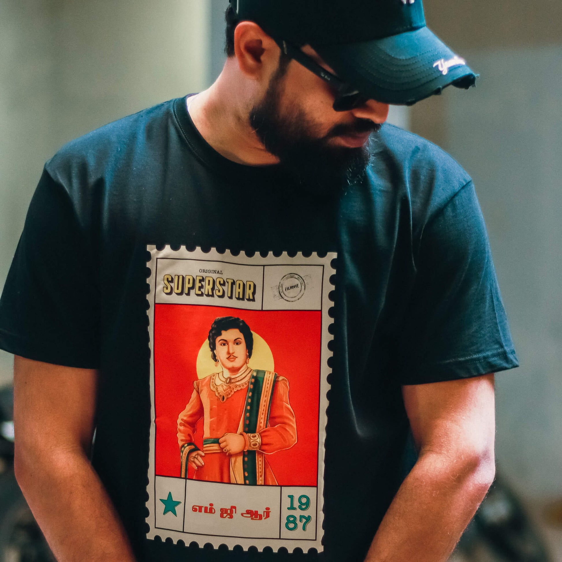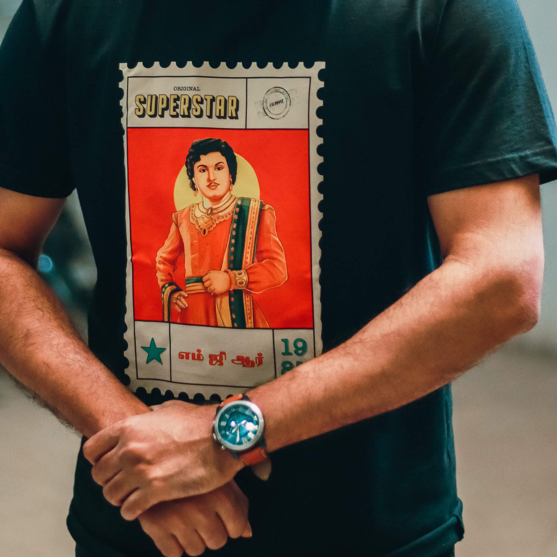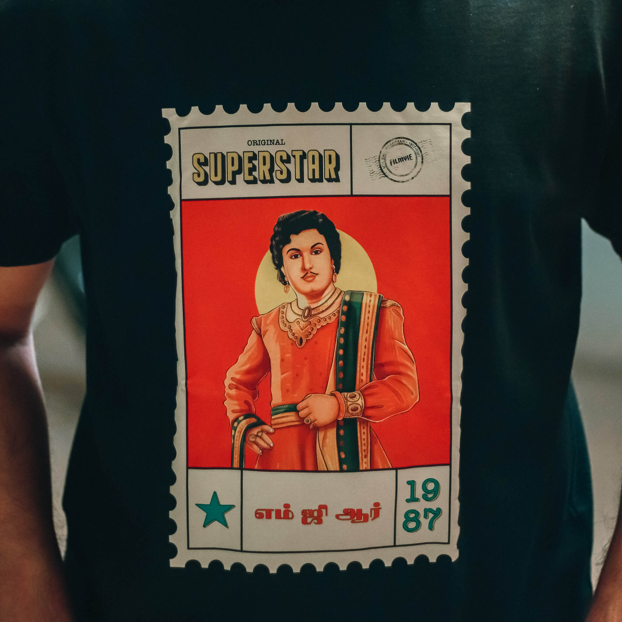 Vintage postage stamp–style tribute tee celebrating M.G.R.’s cinematic and political legacy.